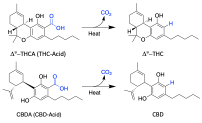En el siguiente diagrama, el grupo carboxilo está resaltado en azul en los compuestos de la izquierda. Se eliminan un átomo de carbono y dos de oxígeno para obtener THC y CBD cuando el THCA y el CBDA se exponen al calor.